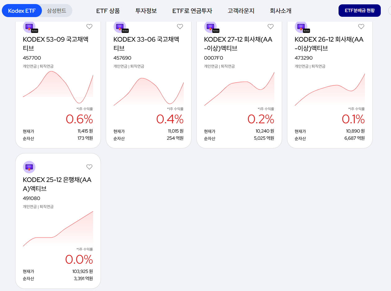 실제로 이 상품이 지금 시점에서 좋을 수도 있긴 한데, 매일경제에서 기사를 뽑으면서 삼성자산운용에서 판매하는 KODEX 26-12 금융채(AA-이상)액티브를 소개하는 기사를 썼으니 상품에 대한 신뢰도는 많이 훼손되네요.