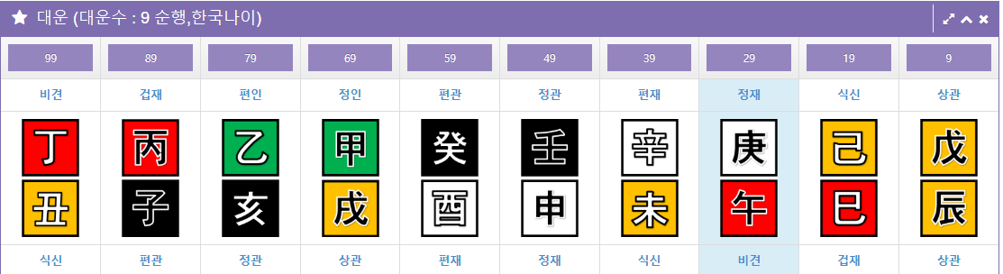 현재가 경오 대운입니다. 이 대운은 2017년 부터 2026년 까지의 기간에 해당됩니다.