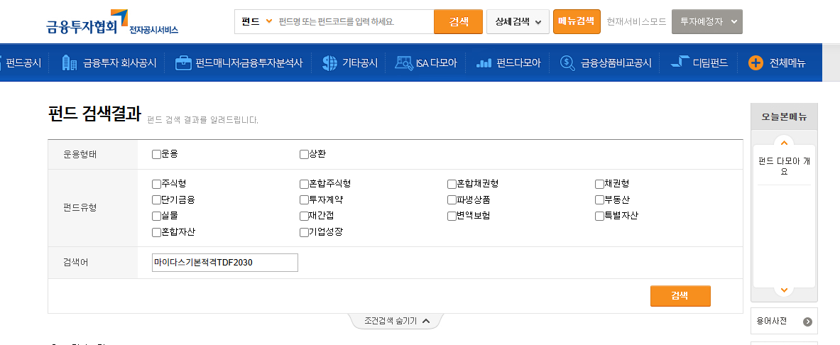 펀드를 누렀더니 금융투자협회 전자공시서비스로 넘어갑니다. 검색창에서 TDF를 쳤더니