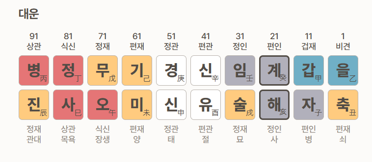 작년부터 대운이 바뀌었는데, 계해의 위, 아래에는 편인, 정인이라는 글자가 쓰여 있습니다.